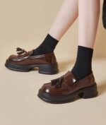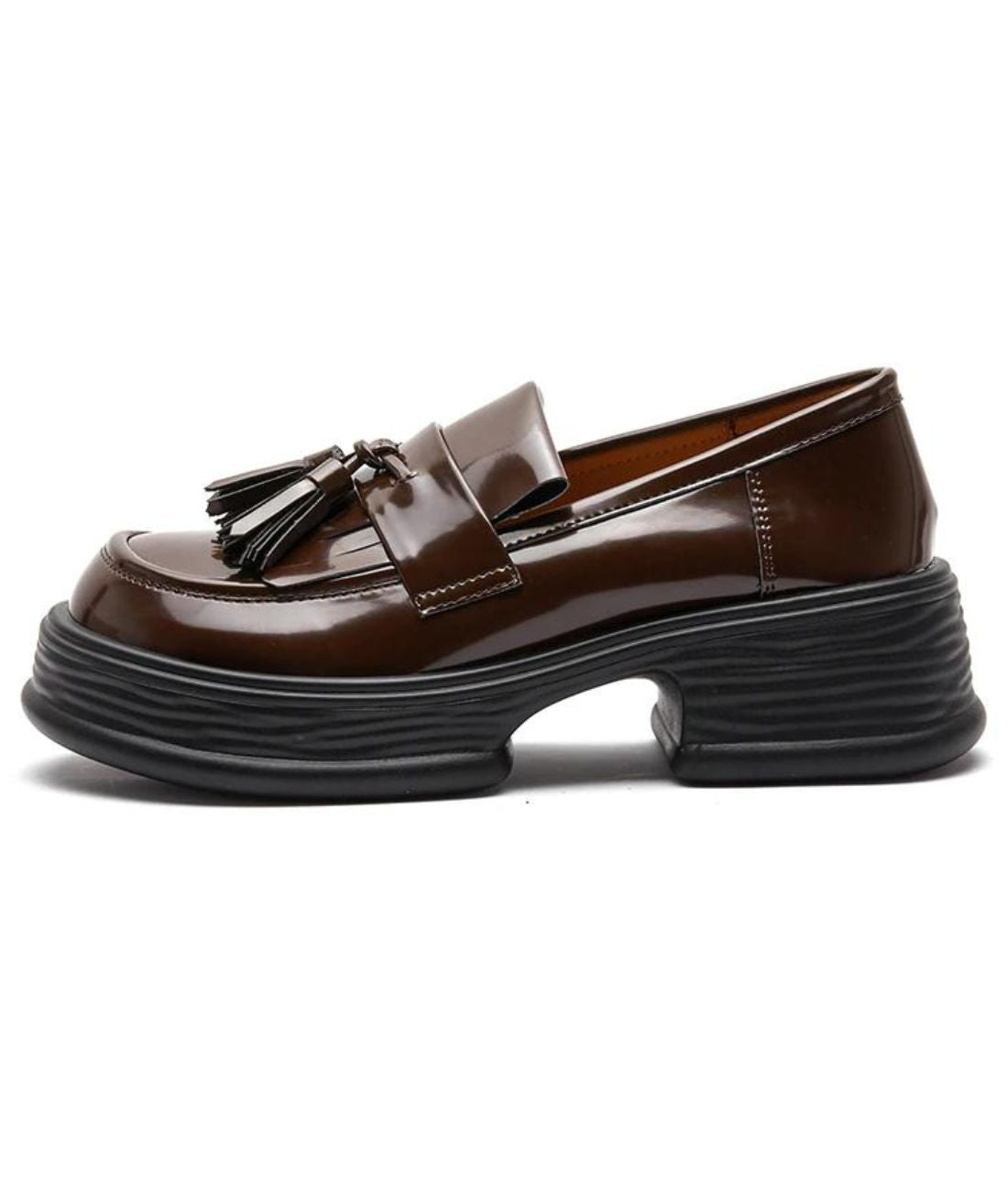 Entdecken Sie ein Paar Loafer für Damen , das Eleganz und Modernität vereint. Diese aus echtem Leder gefertigten Mokassins zeichnen sich durch Glanz und raffinierten Stil aus. Ihr Design umfasst eine doppelte braune Quaste an der Oberseite, die eine perfekte Harmonie mit der Hauptfarbe dieses Stadtschuhs schafft. Die 5 cm dicke Sohle bietet nicht nur einen edlen Look, sondern auch eine schlanke Silhouette, die von Frauen sehr geschätzt wird.