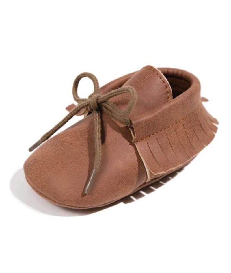 Μικρές πλευρικά κρόσσια προσθέστε μια πινελιά ινδικού στυλ σε αυτά τα μοκασίνια σε στυλ βάρκας, μεταμορφώνοντας το παιδί σας σε έναν πραγματικό μικρό Απάτσι έτοιμο για νέες περιπέτειες. Διαθέσιμα για νεογέννητα έως μωρά ηλικίας 6 έως 12 μηνών, αυτά τα μοκασίνια θα συνοδεύουν το παιδί σας στα πρώτα του βήματα και μετά.