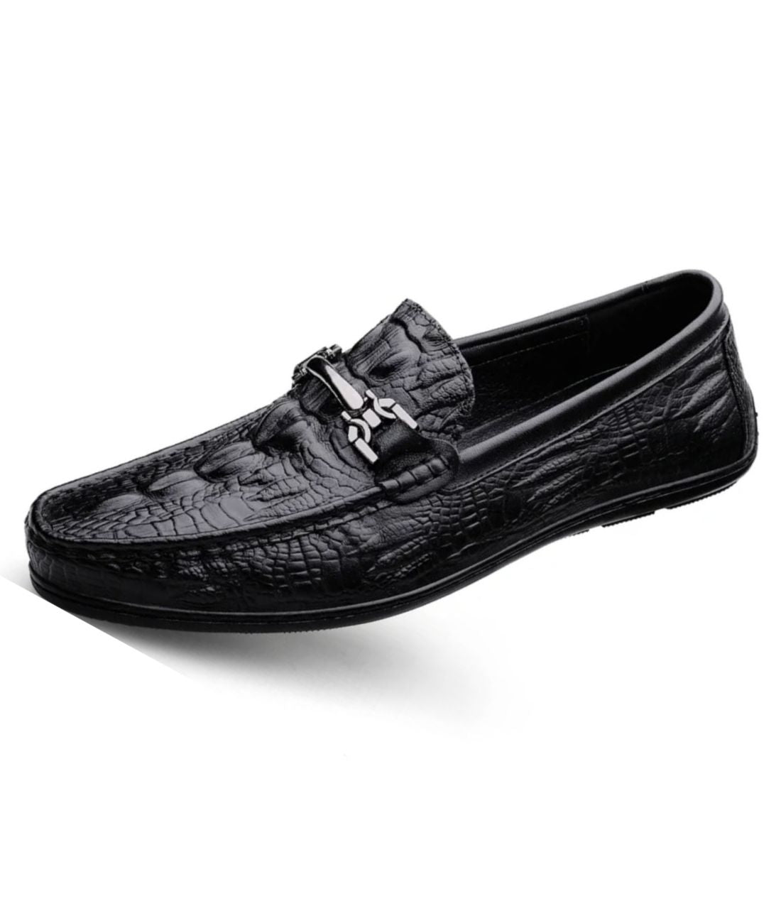 Made from high quality PU leather, these moccasins mold to the shape of your feet for optimal comfort. The upper is decorated with two elegant buckles connected by a silver iron upper, providing a striking contrast to the intense black of the shoes. The heat-embossed snake scale patterns add a touch of originality and sophistication.