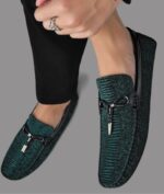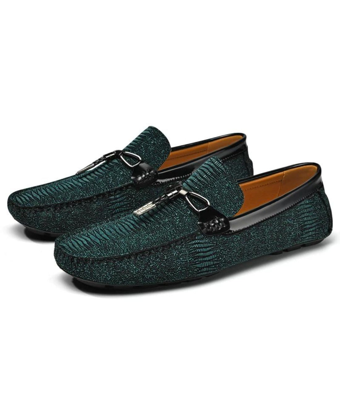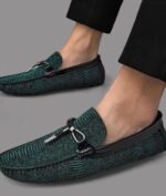 Casque sensación con estos mocasines únicos hechos de cuero genuino, adornados con un patrón de cocodrilo en relieve. Su color verde esmeralda aportará un toque de originalidad a tu outfit, ideal para ocasiones especiales.