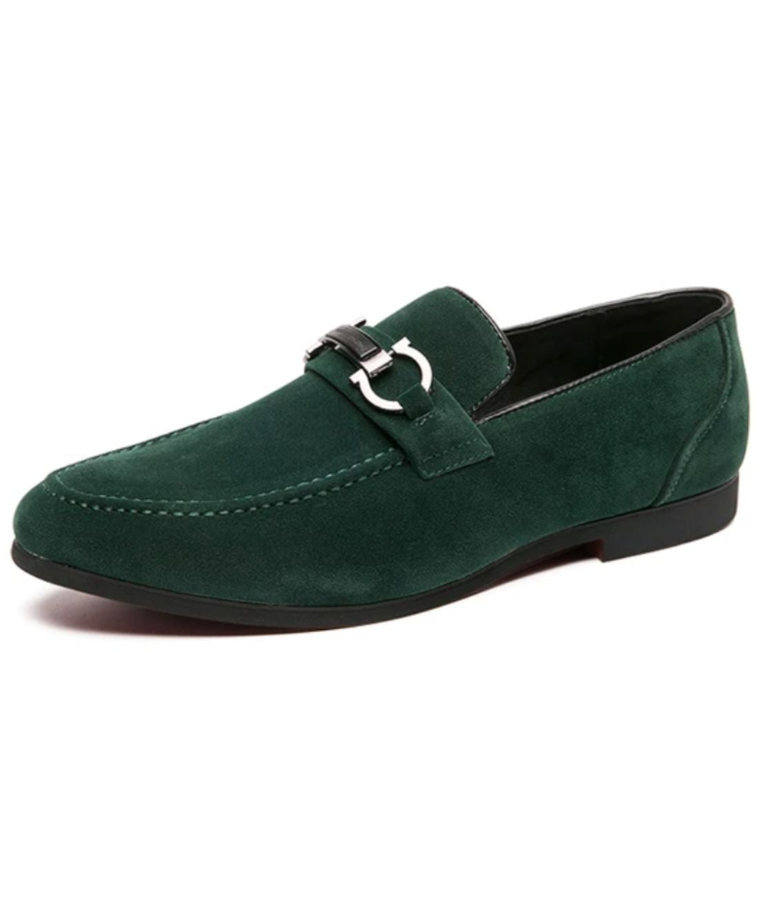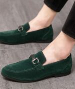 Nämä mokkanahkaiset mokasiinit syvässä kuusessa vihreät, ovat ihanteellinen vaihtoehto syys-talvikaudelle. Mallissa on hopeanvärinen metallisolki vampissa, joka lisää ripauksen eleganssia kenkään. Terävä kärki yhdistettynä silkkiseen rakenteeseen takaa hienostuneen tyylin ja optimaalisen mukavuuden jaloillesi.