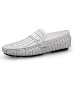 Hai una grande occasione in arrivo, come un matrimonio o una vacanza speciale? Questi mocassini in vera pelle, in puro bianco con striature nere, sono perfetti per aggiungere un tocco di raffinatezza al tuo outfit. Questo classico modello di barca è una scelta sicura per gli uomini che desiderano rinnovare il proprio guardaroba con un capo allo stesso tempo chic e confortevole.