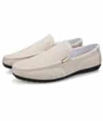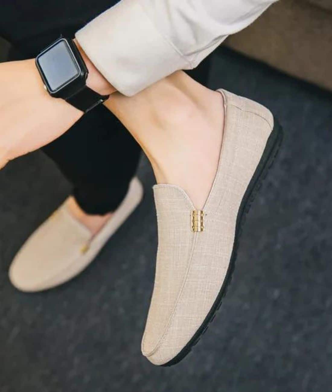 Deze crèmebeige loafers vallen op door een kleine gouden gesp aan de zijkanten, voor een discreet vleugje luxe. Ze zijn voorzien van een platte zool van zwart rubber en bieden uitstekende grip en grote duurzaamheid. Het verfijnde textielinterieur zorgt voor uitzonderlijk comfort bij elke stap.