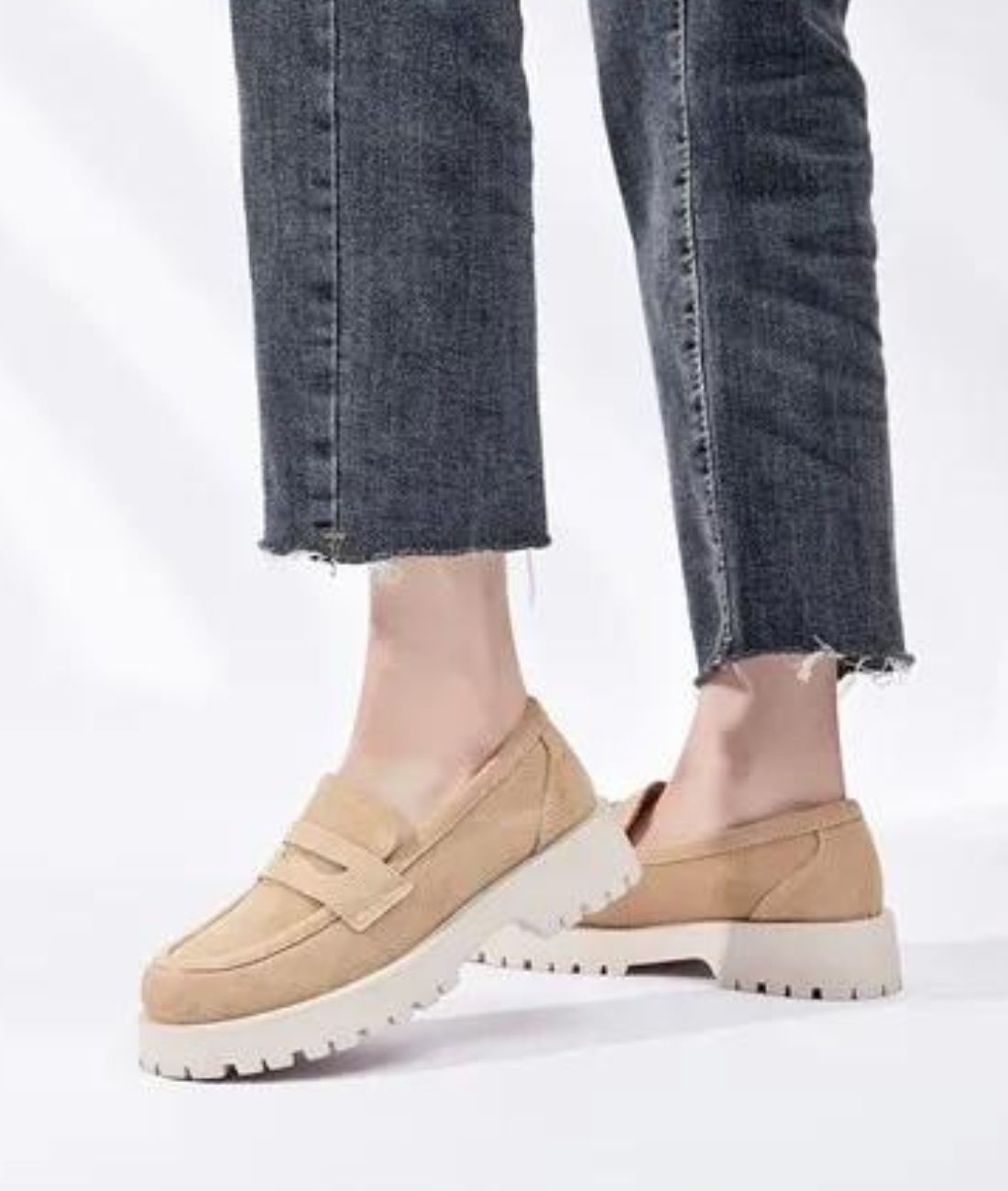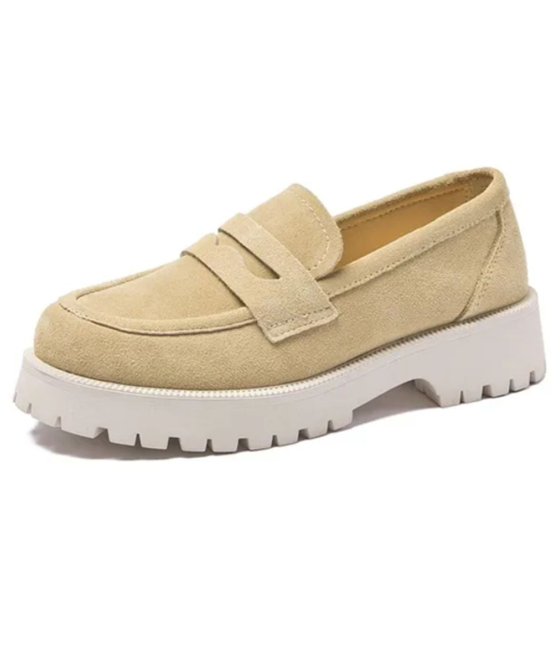 Ontdek deze prachtige mocassins gemaakt van echt suède in kaki kleur, versierd met een witte gekerfde zool. Dit model combineert verfijning en moderniteit, perfect voor de vrouw die houdt van pasteltinten en gedistingeerde stadsoutfits.