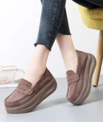 Deze hoge mocassins met sleehak van 5 cm past perfect bij je stadsbroek of andere verfijnde outfits. Door hun unieke kleur zijn ze gemakkelijk te combineren met verschillende stijlen, terwijl het subtiele contrast tussen het lichtbruine suède bovenwerk en de neutraal getinte rubberen zool voor een harmonieuze tweekleurige look zorgt. Of het nu herfst of lente is, deze schoenen zijn ontworpen om jouw stijl en je natuurlijke zachtheid te benadrukken.