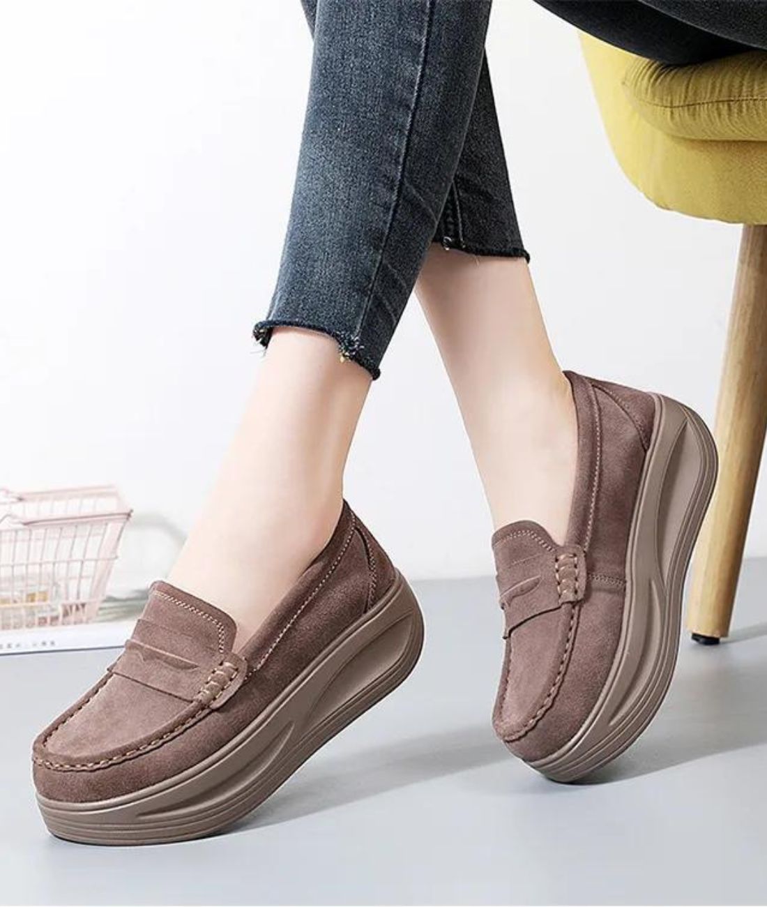 Adopteer deze suède mocassins met sleehak voor een verfijnde look en ongeëvenaard comfort, en laat uw elegantie bij alle gelegenheden tot uitdrukking komen.