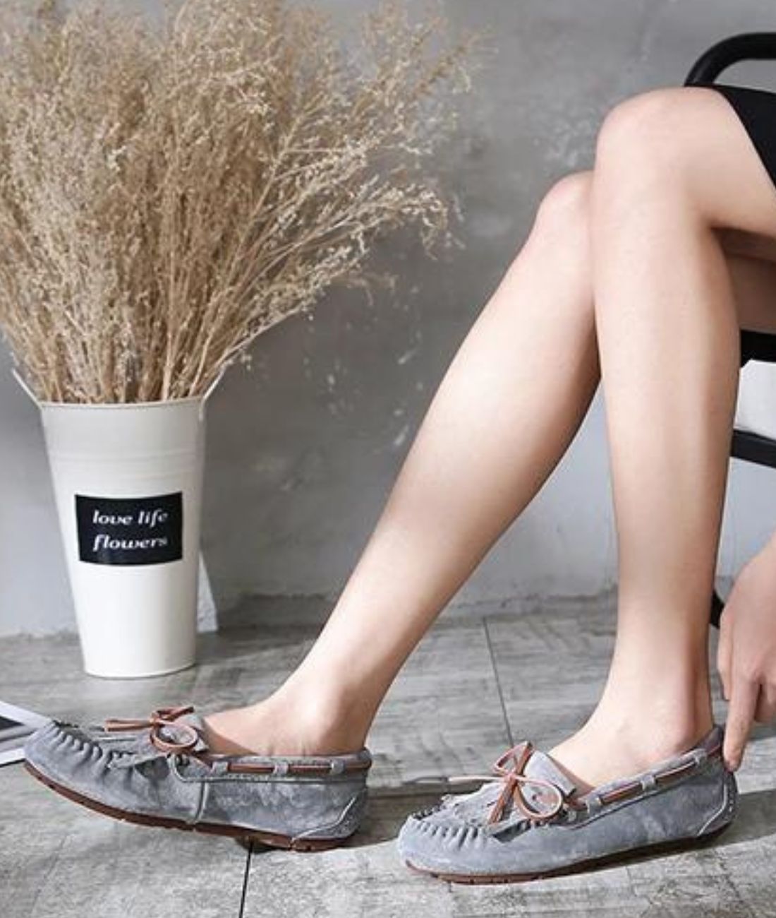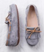 strong> for women, een levendig eerbetoon aan de eerste modellen gecreëerd door inheemse volkeren. Uitgerust met bruine leren veters zorgen ze voor een gemakkelijke en veilige bevestiging. Het subtiele huwelijk van donkergrijs suède en bruine veters geeft deze schoenen een charme die zowel traditioneel als verfijnd is. Deze mocassins van echt suède zijn voorzien van franjes op de bovenkant , trots herinnerend aan hun historisch erfgoed. Het ronde neusontwerp en de ecru suède binnenzool garanderen uitzonderlijk comfort. Geïnspireerd door de eerste Indiase mocassins, zullen deze damesloafers verleiden met hun vintage elegantie en casual look. Of het nu gaat om een uitje in de stad of een uitstapje naar het platteland, deze suède mocassins zijn perfect voor het lente- en zomerseizoen. De lichtbruine rubberen zool beschermt je voeten en biedt optimale grip op diverse ondergronden.Authentieke kenmerken en ongeëvenaard comfort
