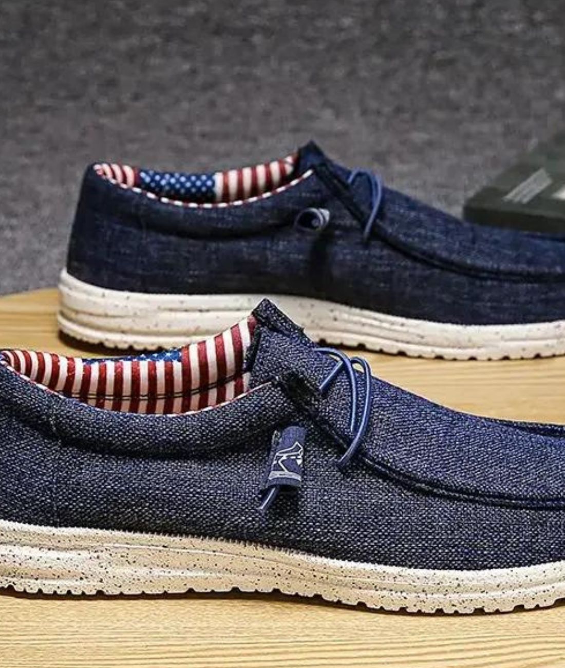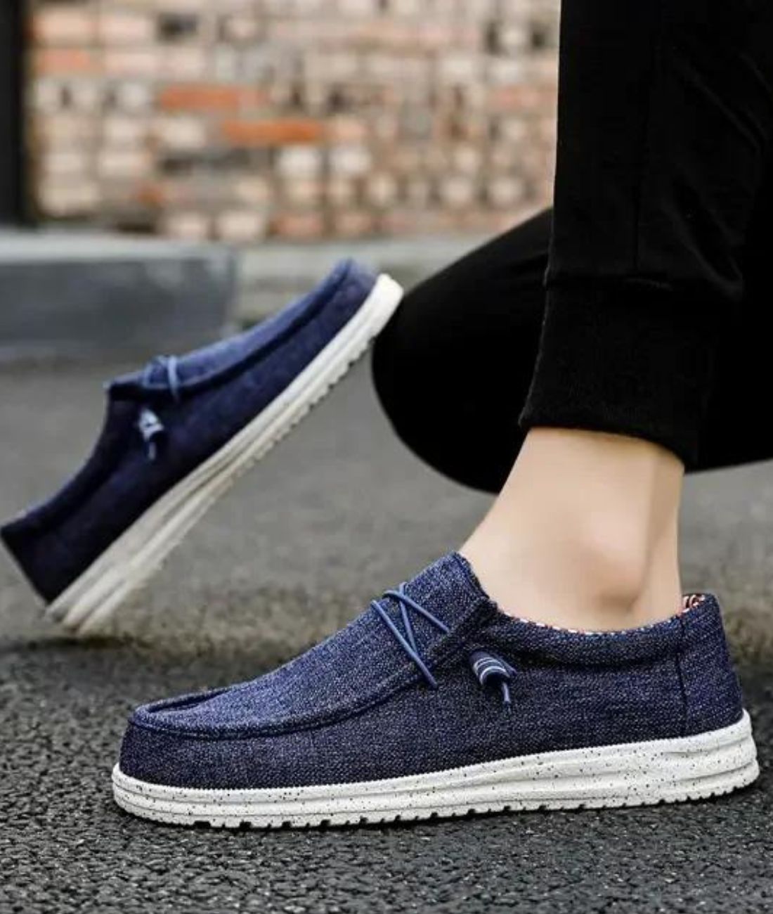 Deze loafers zijn gemaakt van katoenen canvas met een donkerblauwe denim textuur en zijn perfect voor een gepolijste of casual urban look. De binnenkant van de schoen is versierd met witte en rode strepen, wat zorgt voor optimaal comfort voor de voetboog en de enkel.