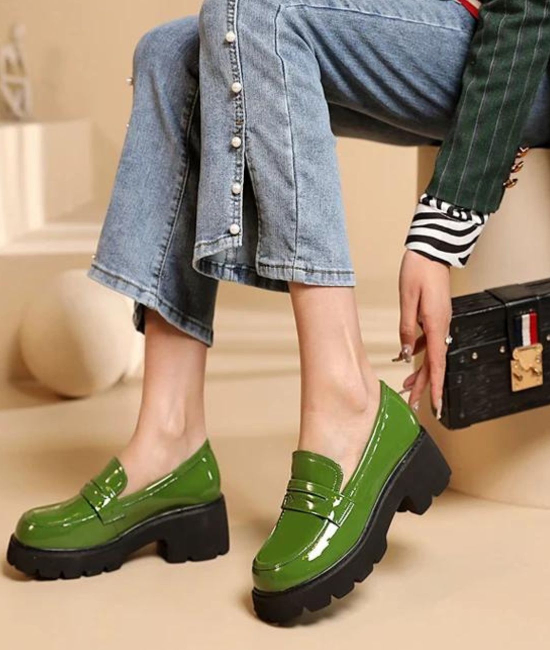 Ontdek de onweerstaanbare charme van deze vrouwelijke mocassin met platform, versterkt door een zachtgroene tint. Dit model is ideaal voor de schouderseizoenen en combineert stijl en functionaliteit perfect.