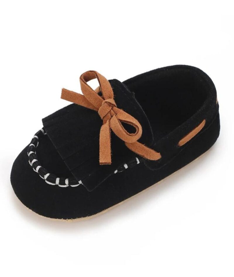 Adoráveis ​​mocassins pretos em textura aveludada para meninos