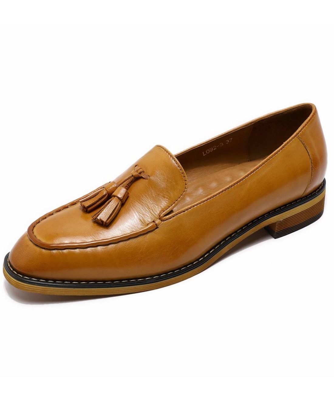 Descubra a aliança perfeita entre elegância e conforto com estes mocassins com borlas para mulheres. Ostentando um refinado tom camelo e borlas de couro marrom na lingueta, esses sapatos personificam um estilo chique e casual, ideal para todas as ocasiões do dia a dia. Fabricados em couro genuíno, estes mocassins macios e flexíveis homenageiam os designs tradicionais ao mesmo tempo que acrescentam um toque de modernidade.