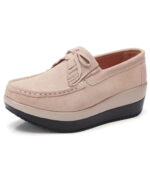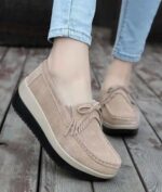 Feitos de camurça genuína sedosa, estes sapatos se destacam pela sola dupla grossa disponível em bege claro e preto. Essa combinação de cores traz um toque de contraste suave e moderno, ideal para a mulher contemporânea. O bege rosa destes mocassins encarna uma elegância glamorosa, perfeito para quem procura uma combinação perfeita de estilo e conforto.