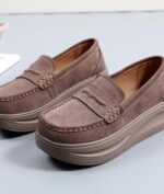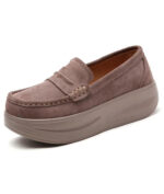Tieto vysoké mokasíny s klinová podrážkas 5 cm sa perfektne hodí k mestským nohaviciam alebo iným sofistikovaným outfitom. Vďaka ich jedinečnej farbe sa dajú ľahko spárovať s rôznymi štýlmi, zatiaľ čo jemný kontrast medzi svetlohnedým semišovým zvrškom a gumenou podrážkou neutrálneho odtieňa vytvára harmonický dvojfarebný vzhľad. Či už na jeseň alebo na jar, tieto topánky sú navrhnuté tak, aby zvýraznili váš štýl a vašu prirodzenú mäkkosť.